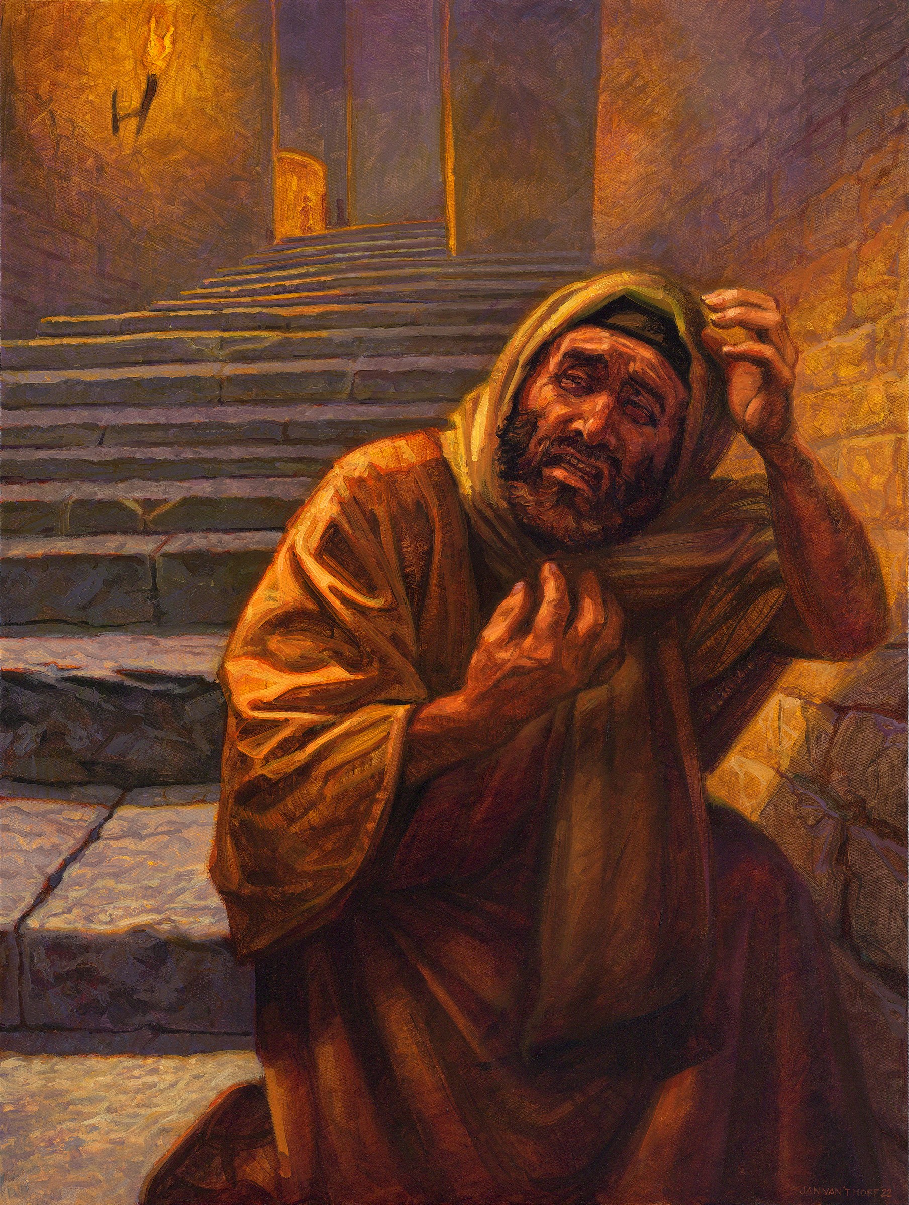 Satan brengt Petrus zover dat hij Jezus driemaal verloochent. Dan draait Jezus Zich om en kijkt Hij Petrus aan. Daarop krijgt Petrus diep berouw. Hij gaat naar buiten en huilt bitter.