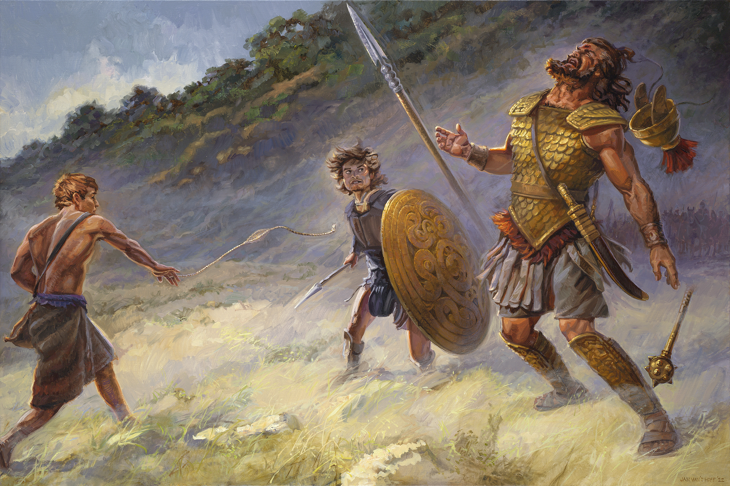 Goliath is een Filistijnse kampvechter met een lengte van ongeveer 3 meter die een indrukwekkende wapenrusting draagt. Hij daagt de Israëlieten uit een man te sturen om tegen hem te vechten. Beide mannen vechten dan plaatsvervangend voor hun legers. Saul en de Israëlieten zijn echter bang voor Goliath. Als David in het Israëlitische kamp komt, zegt hij: ‘…wie is deze onbesneden Filistijn wel, dat hij de gelederen van de levende God durft te honen?’ (1 Samuël 17 vers 26). Deze woorden kunnen worden verstaan tegen de achtergrond van de opdracht uit Deuteronomium 7, waar Israël van God de opdracht krijgt om de Kanaänitische volken met de ‘ban te slaan’ ofwel uit te roeien. Deze volken worden als straf op hun zonden verdreven uit het land Kanaän, het land dat God Israël heeft beloofd. Israël is echter niet meer dan een instrument in Gods hand, want God zelf voert de strijd aan. Zoals de strijd tegen Jericho werd aangevoerd door de Bevelhebber van het leger van de HEERE, zo weet David dat ook nu ‘de strijd van de HEERE is’ (1 Samuël 17 vers 47). Dat geeft hem een enorme geloofsmoed. Hij treedt Goliath tegemoet ‘in de Naam van de HEERE van de legermachten’, en doodt Goliath. God de HEERE is de ware Koning van Israël. David zal later ‘onderkoning’ onder God zijn.