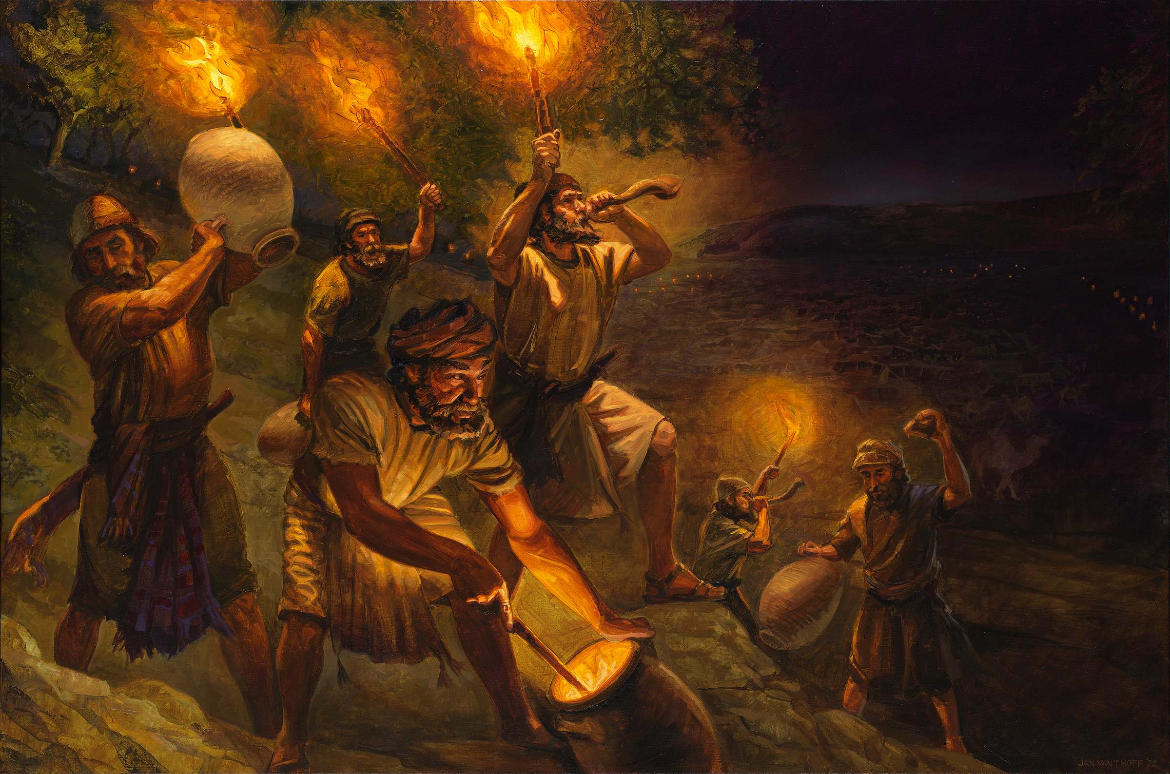 Eerst krijgt Gideon de opdracht om het altaar dat zijn vader aan de afgod Baäl heeft gewijd af te breken, en een altaar voor de HEERE te bouwen. Vervolgens wordt de strijd tegen de Midianieten voorbereid. Het leger van 32.000 man dat Gideon verzamelt, is te talrijk in de ogen van de HEERE. Het mag niet zo zijn dat Israël zou kunnen zeggen: ‘Mijn eigen hand heeft mij verlost!’ (Richteren 7 vers 2) Na selectie blijft uiteindelijk een legertje van slechts 300 man over. In het dal tussen de berg Gilboa en de heuvel Moreh ligt het grote leger Midianieten en Amalekieten, met hun kamelen. ‘Zo talrijk als de zandkorrels die zich aan de oever van de zee bevinden.’ (Richteren 7 vers 12) Als de mannen van Gideon – verdeeld in drie groepen van honderd – tegen middernacht de Midianieten omsingelen en hen schrik aanjagen met hun bazuinen, fakkels, strijdkreten, en het geluid van brekend aardewerk, brengt de HEERE de Midianieten zo in paniek dat ze elkaar onderling gaan bevechten en op de vlucht slaan.