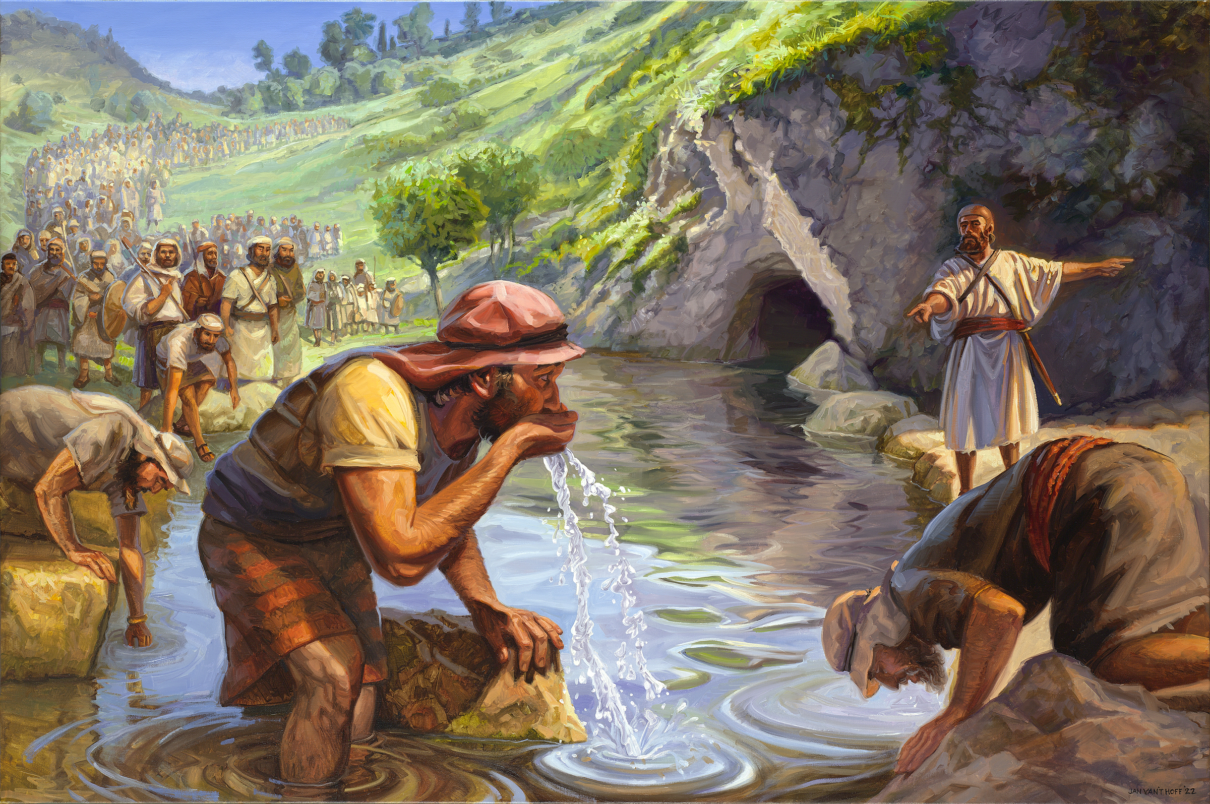 Gideon moet degenen die bevreesd zijn voor de strijd wegsturen. Tweeëntwintigduizend mannen vertrekken; tienduizend blijven er over in het kamp op het Gilboa gebergte. In Gods ogen nog steeds teveel. Gideon moet het volk laten afdalen naar het water van de bron Harod, en de mannen die daarvan drinken door het water met de hand naar de mond te brengen, worden uitgekozen. Een legertje van driehonderd man blijft over. Zo’n klein legertje lijkt kansloos tegen de talrijke Midianieten, maar God is met hen!