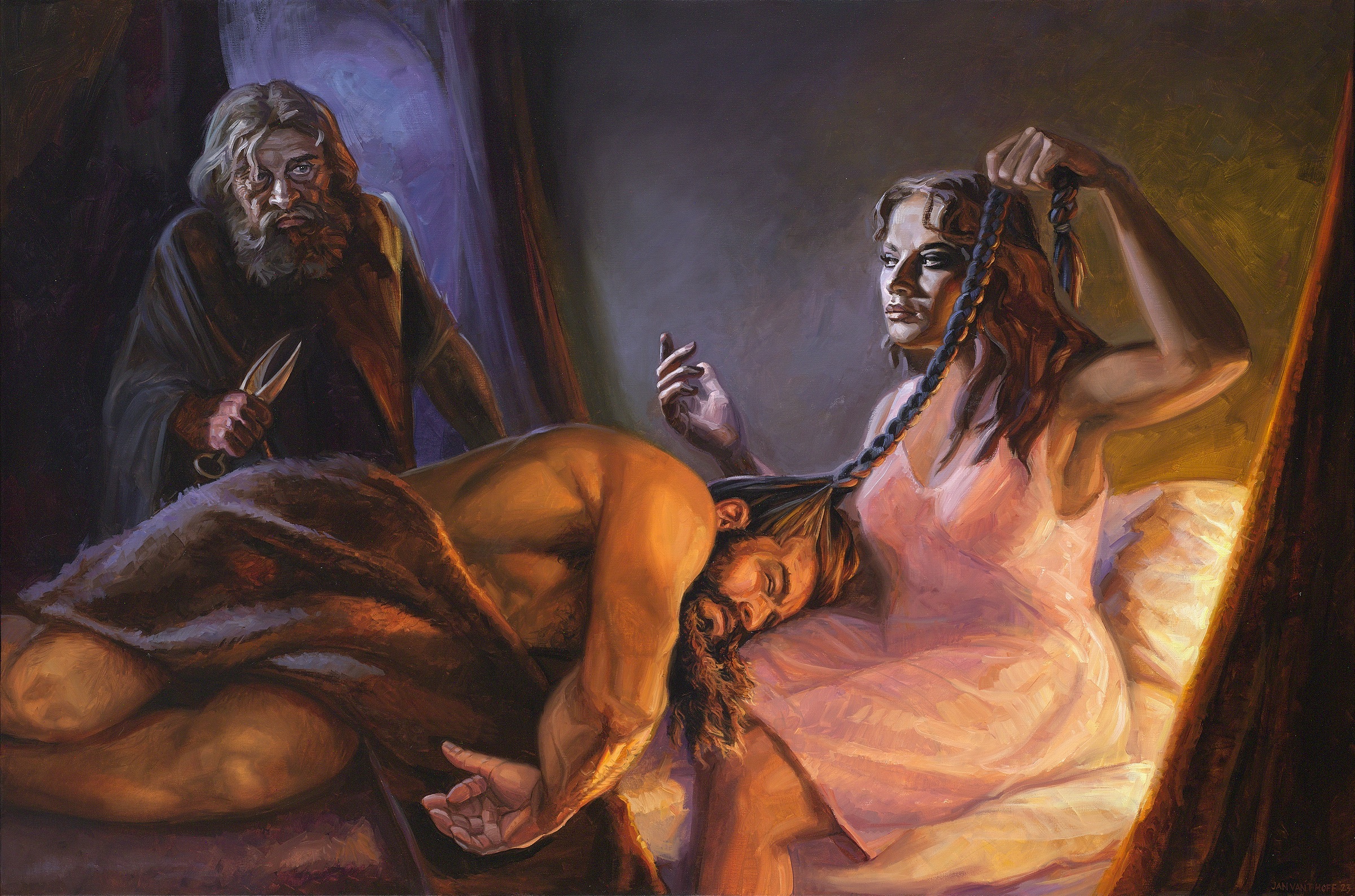 Daarna liet zij hem op haar knieën slapen, riep een man en liet hem de zeven haarlokken van zijn hoofd afscheren. En zij begon hem te vernederen en zijn kracht week van hem.Volledige bijbeltekst