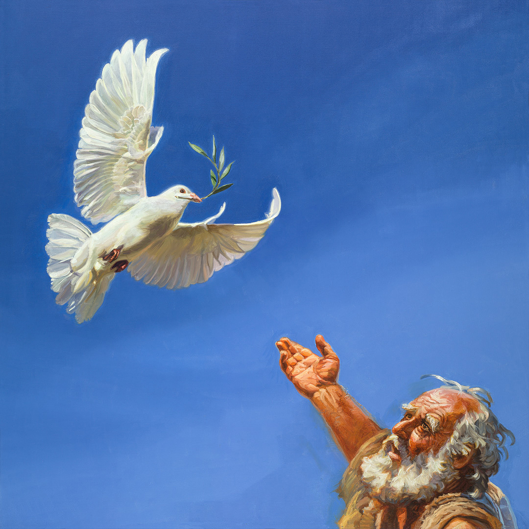 Een week later laat Noach de duif voor de tweede keer los. Nu komt de duif terug met een vers, afgebroken olijfblad.