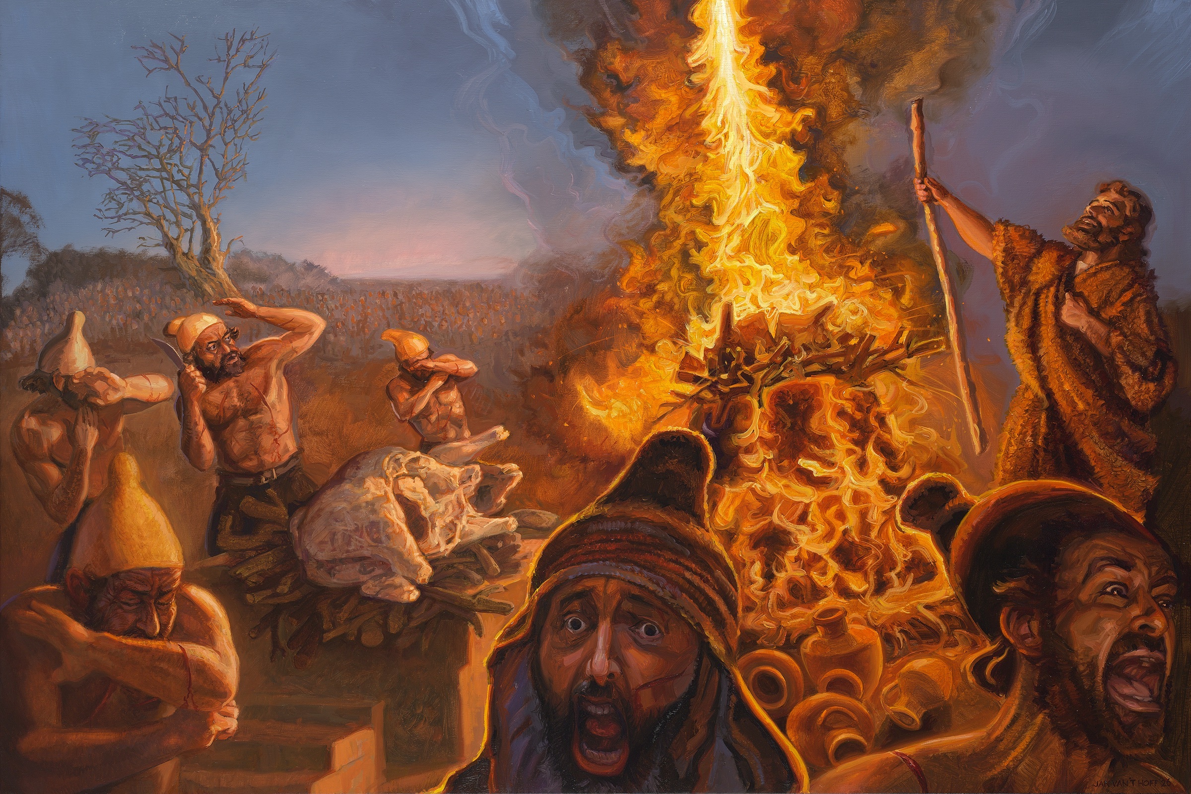 ‘Toen viel er vuur van de HEERE neer, verteerde het brandoffer, het hout, de stenen en het stof. Zelfs het water in de geul likte het op’.Volledige bijbeltekst
