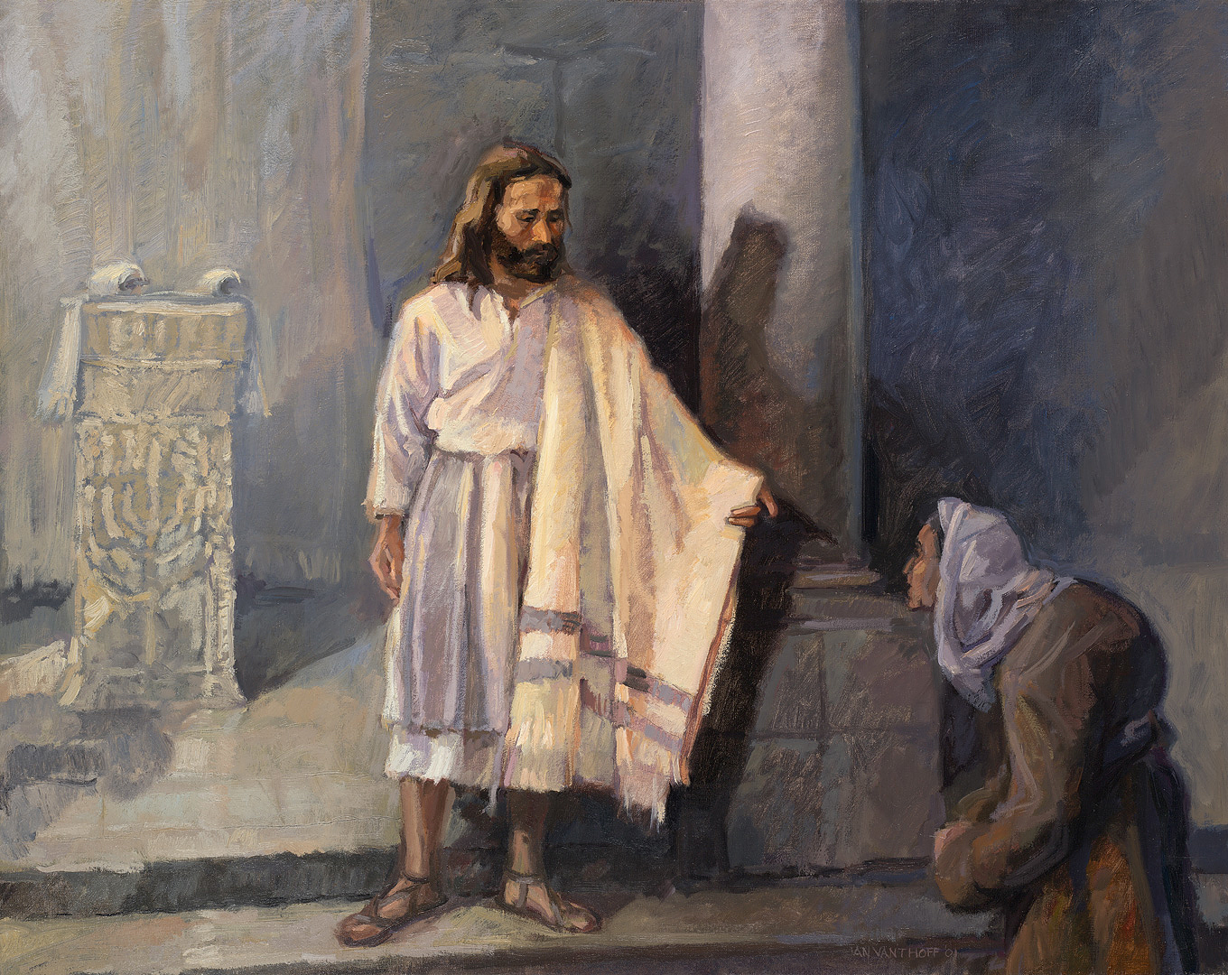 Hij legt de handen op haar en ze wordt onmiddellijk genezen.