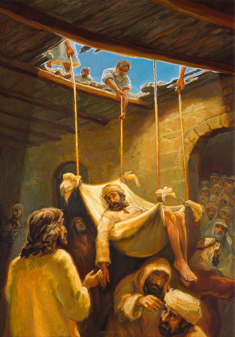 De vrienden klimmen omhoog en laten de verlamde man door een gat in het dak zakken tot voor de voeten van Jezus.