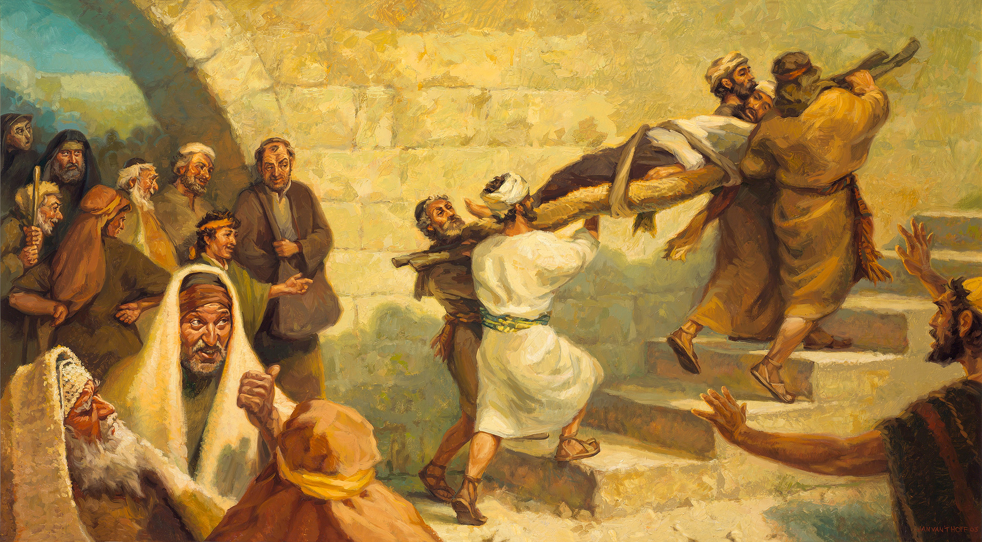 Op dit schilderij zie je de vrienden van een verlamde man. Ze zijn vastbesloten om hun vriend naar Jezus te brengen en bereid om daarbij tot het uiterste te gaan. Het geloof overwint de fysieke beperkingen op hun weg.