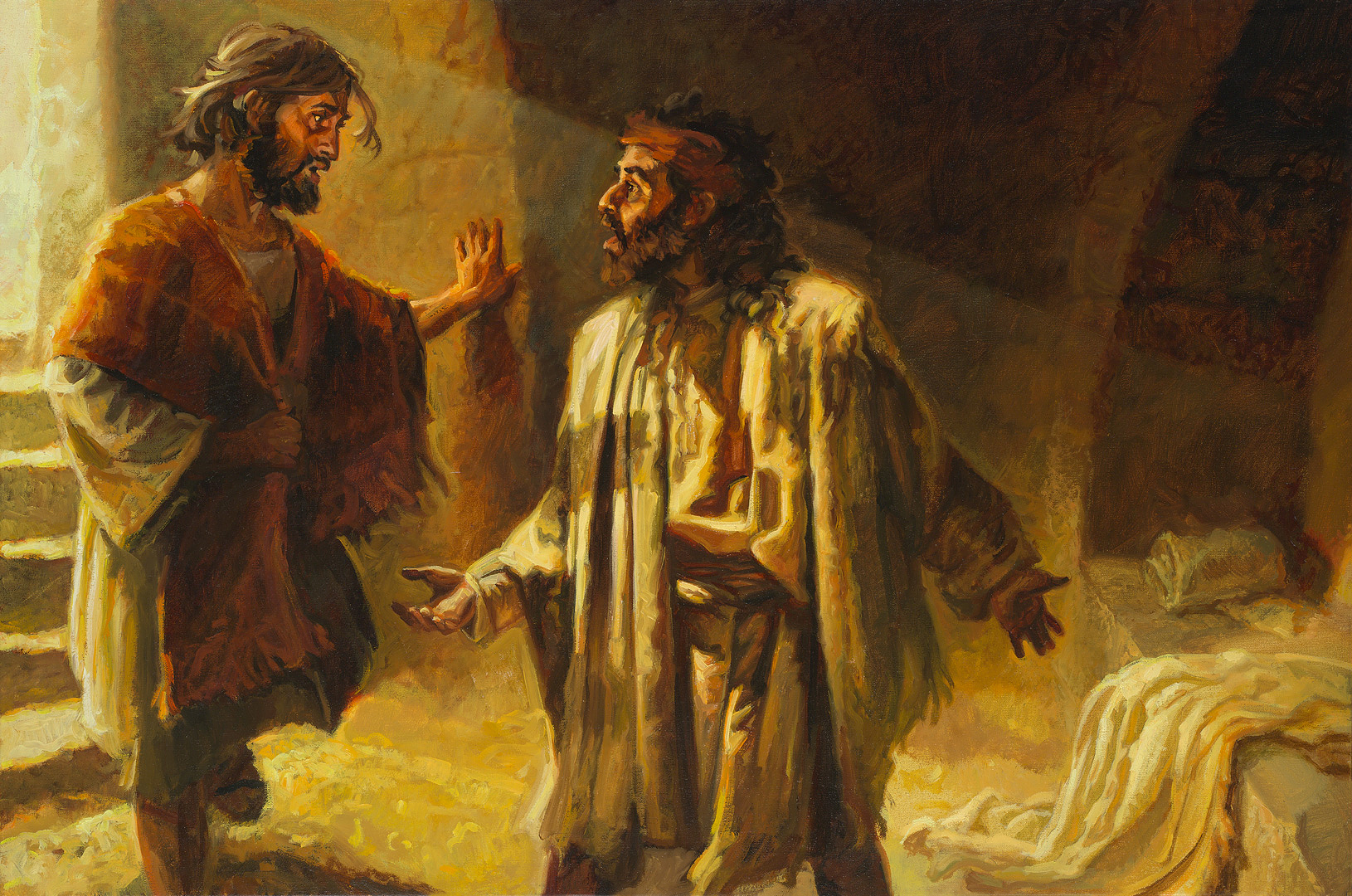 Als stille getuigen van de opstanding van Jezus liggen daar de doeken waar Jezus’ dode lichaam in gewikkeld was. Van Johannes lezen we dat hij 'zag en geloofde'.