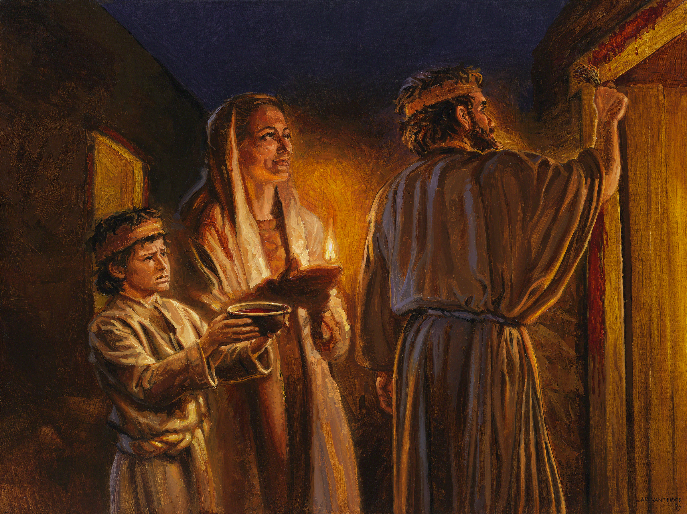Op het schilderij zie je een eerstgeboren zoon die toekijkt hoe zijn vader het bloed op de deurposten aanbrengt.