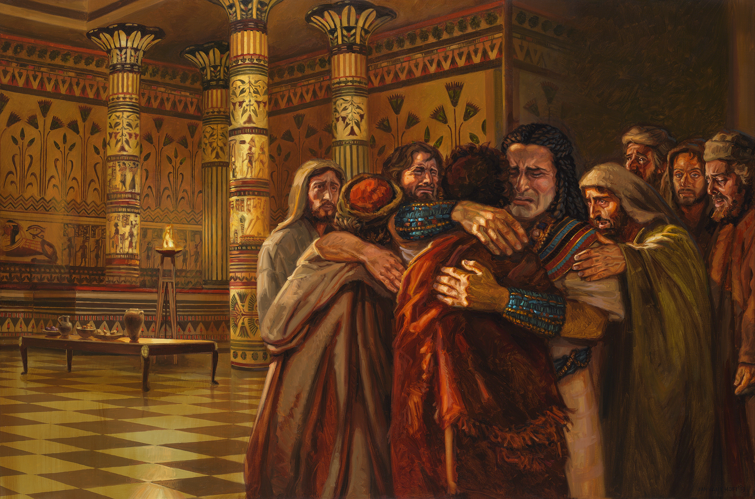 Daarna volgt een emotionele begroeting. Eerst valt hij zijn broer Benjamin - net als Jozef een zoon van Rachel - om de hals en huilt. En vervolgens ook zijn andere broers.