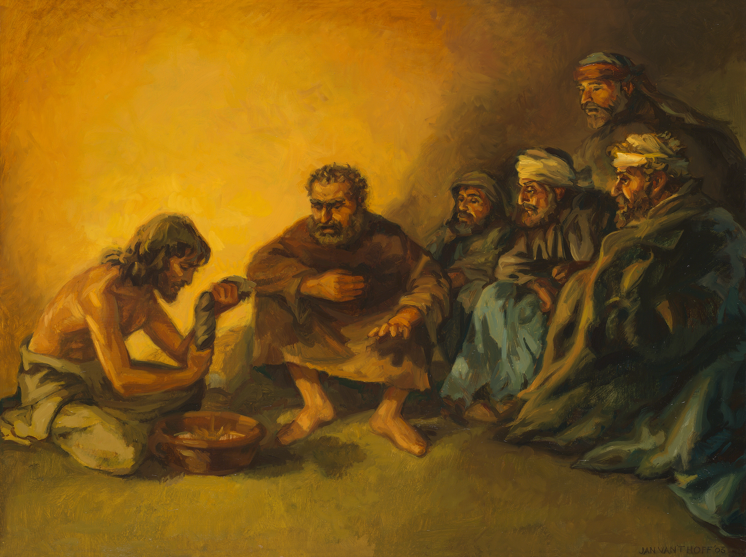 Jezus, de Zoon van God, vernedert Zichzelf door de voeten van Zijn discipelen te wassen. Dat was eigenlijk het werk van een slaaf. Hij doet dat om hen een voorbeeld te geven. Zo moeten ook Zijn volgelingen elkaars voeten wassen, dat wil zeggen: elkaar willen dienen.