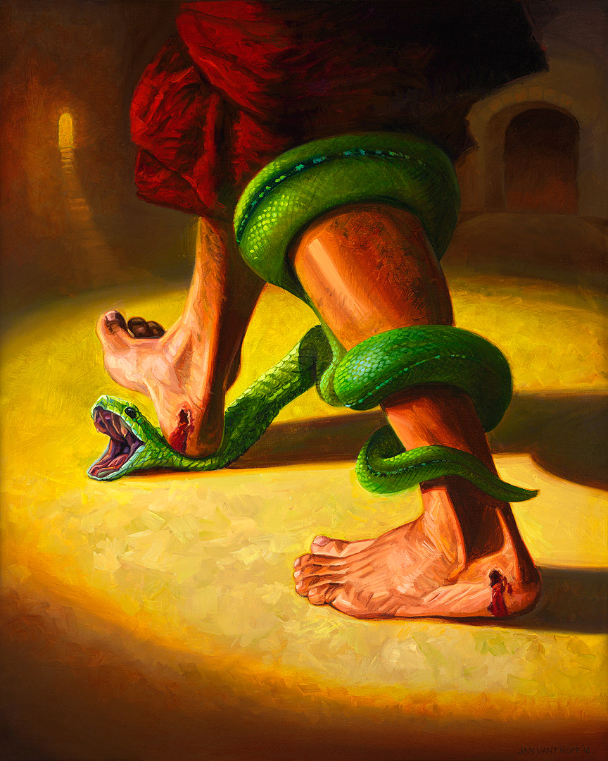 In dit symbolische schilderij vermorzelt Jezus de kop van de slang, het dier dat satan symboliseert. Deze belofte in Genesis is vervuld door Jezus aan het kruis op Golgotha. Je ziet op het schilderij de wonden in Zijn hielen.